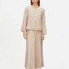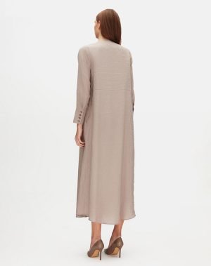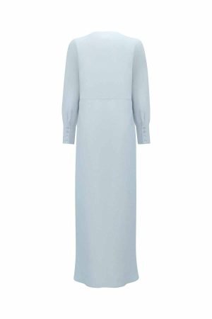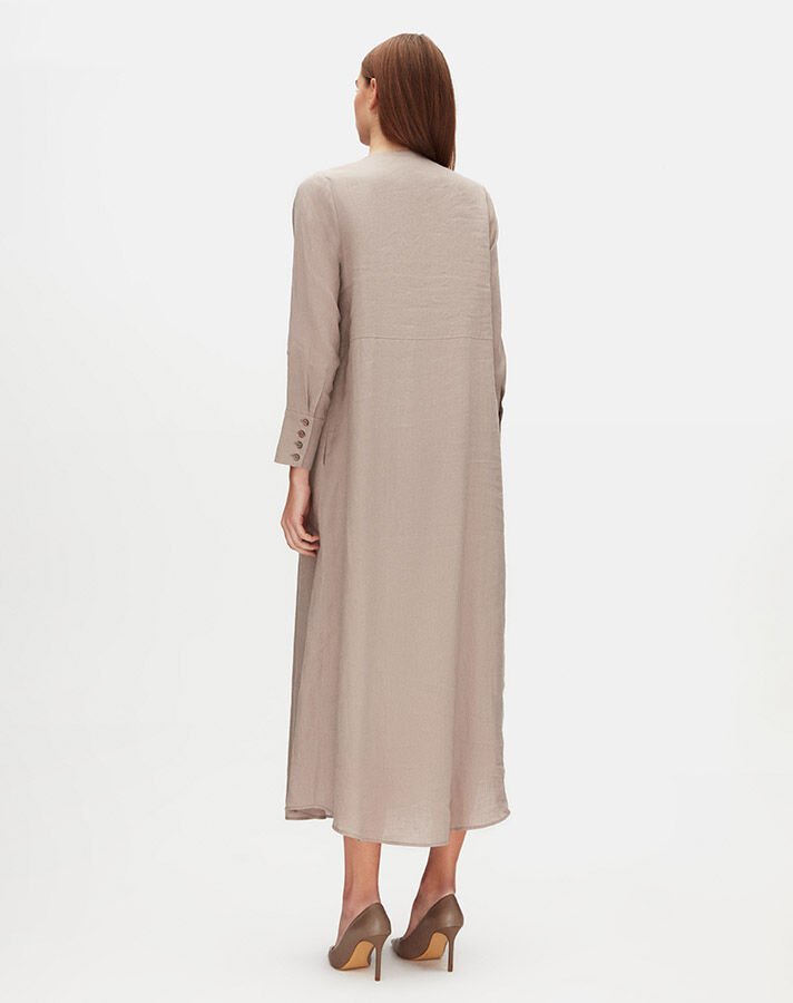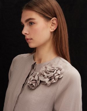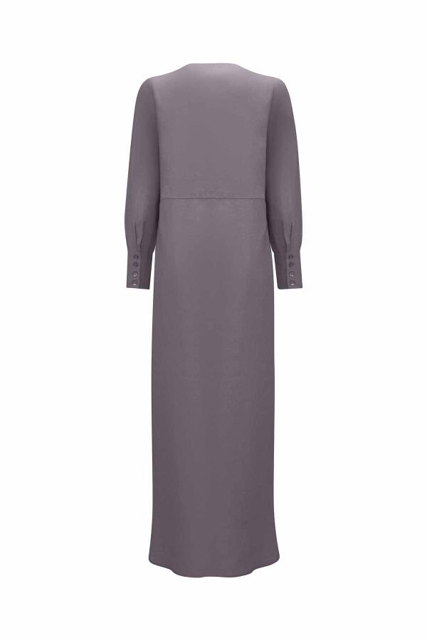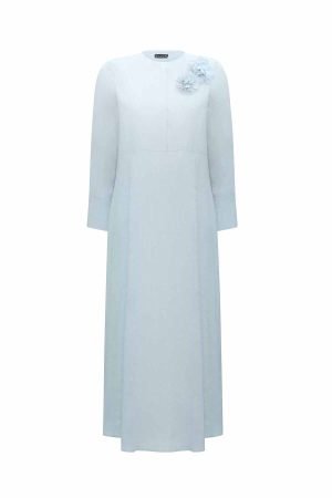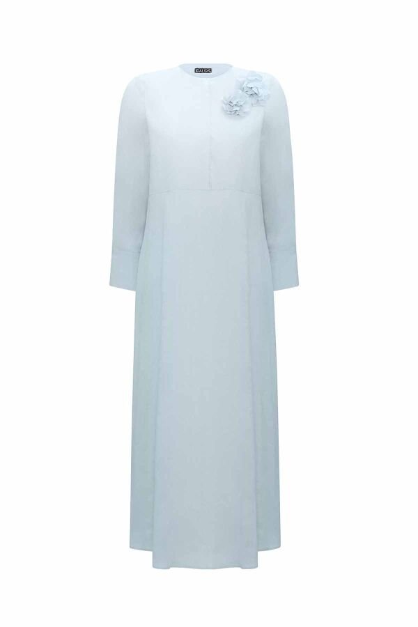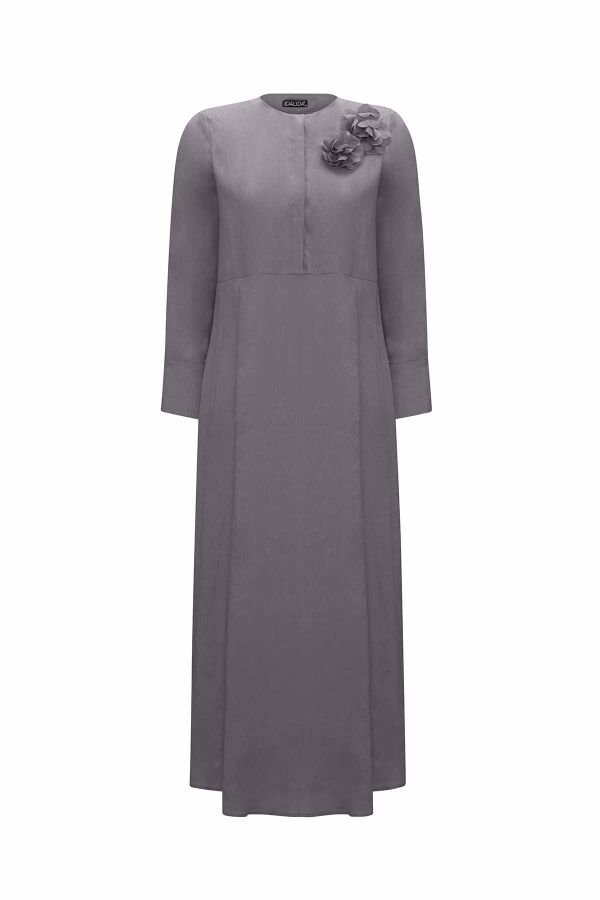 T25Y-4063 / Floral Brooch Detailed Solid Color Linen Dress / فستان من الكتان بلون سادة مزين ببروش زهري